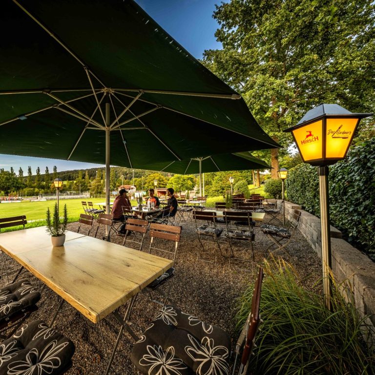 Entspannen Sie in unserem wunderschönen Biergarten - genießen Sie  kühle Getränke, leckere Speisen und die gemütliche Atmosphäre unter freiem Himmel.